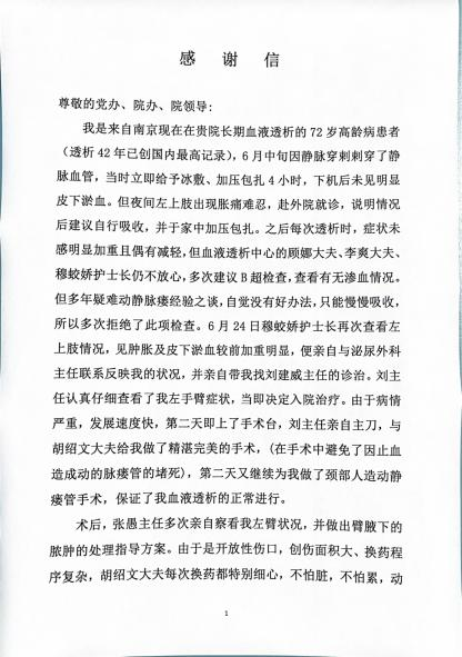 近日,泌尿外科收到了一封饱含深情的感谢信。写信人是一位特殊的患者——来自南京、72岁的祁老先生。他不仅是一位维持性血液透析长达42年的“生命勇士”,更是在近...[详情]